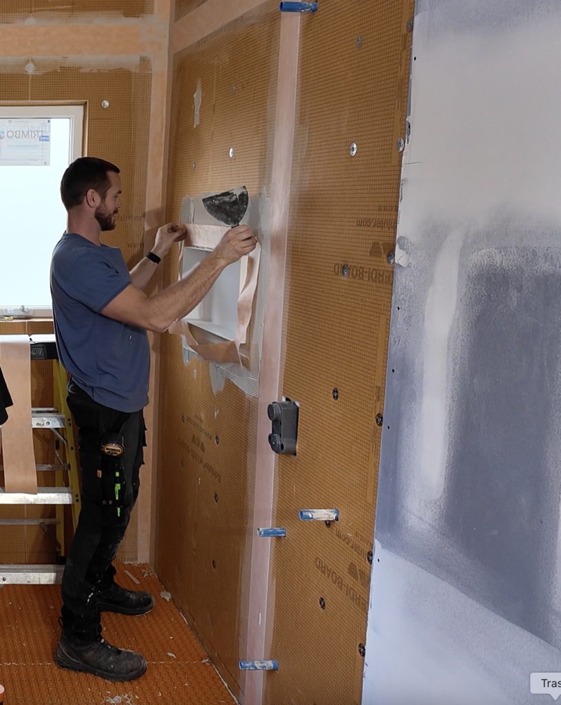 Another essential step in waterproofing our wet-room was ensuring all the seams were properly sealed. Prep all your bands (strips, corners, and squares) in advance because time is money. And using a “hawk” or mortar board holder typically used by drywallers, makes applying thin set faster and cleaner and saves trips to the bucket of mortar.