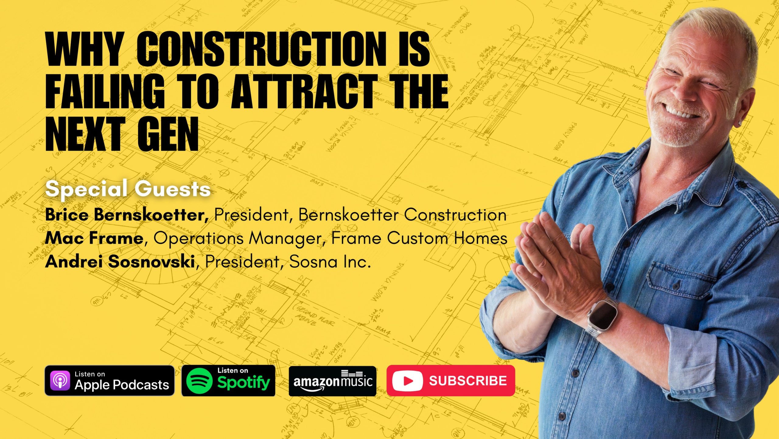 In this episode of the Holmes on Homes podcast, Mike Holmes leads a cross-border discussion on the future of skilled trades and the challenges facing the construction industry. Joining Mike are: Brice Bernskoetter, second-generation builder at Bernskoetter Construction (Missouri, USA), Mac Frame, second-generation builder at Frame Custom Homes (Kelowna, BC) and Andrei Sosnovsky, President of Sosna Inc. (Ontario, Canada).
